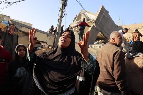 2024年3月3日,在加沙地带南部拉法,一名巴勒斯坦妇女在被以色列空袭摧毁的阿布·安扎(Abu Anza)家门前做出反应以色列和巴勒斯坦激进组织哈马斯之间的冲突仍在继续。(图片来源:SAID KHATIB /法新社)